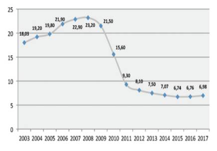 Imaxe 1: Evolución do orzamento de política lingüística de 2005 a 2017, en millón de euros. Fonte:Monteagudo (2019, p. 31).