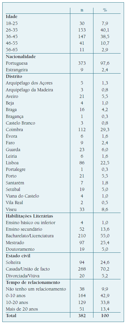 Foi realizado um estudo descritivo transversal que envolveu 415 mulheres, residentes em Portugal, com idades entre os 18 e os 65 anos. O tamanho da amostra foi calculado com recurso ao software Epi-Info com uma prevalência estimada de 55,3% (média das prevalências encontradas para as DSF em Portugal), uma precisão de 5% e um nível de confiança de 95%, resultando num mínimo de 380 mulheres. Recorreu-se a um questionário de auto-resposta disponibilizado online. Obtiveram-se 415 respostas, 18 das quais com preenchimento incompleto, pelo que foram eliminadas. Após aplicação dos critérios de exclusão (não ter iniciado a vida sexual, não residir permanentemente em Portugal e não saber ler e escrever a língua portuguesa), foram eliminados 15 questionários, resultando em 382 questionários.