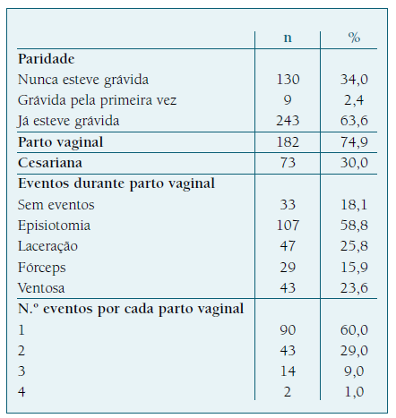 As características sociodemográficas da amostra, assim como dados relativos à história obstétrica encontram-se resumidas nos Quadros I e II. No Quadro II, o “n.º de eventos por cada parto vaginal” corresponde ao número de eventos obstétricos ocorridos ou realizados em cada parto vaginal, incluindo episiotomia, laceração, fórceps e ventosa.