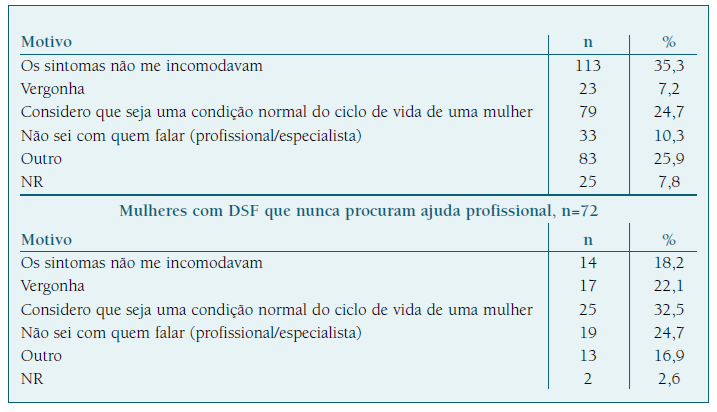 As barreiras que levaram à não ajuda profissional estão apresentadas no Quadro III. No grupo de mulheres com queixas de DSF (n=72) o motivo mais apresentado foi considerarem ser uma condição normal do ciclo de vida da mulher.