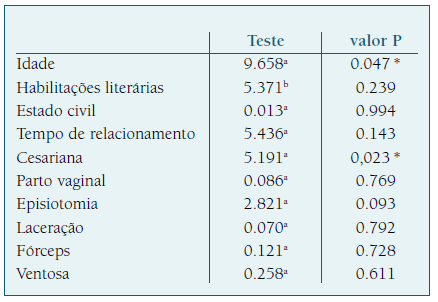 Quando se associaram as variáveis correspondentes aos dados sociodemográficos e história obstétrica com a presença de DSF, verificou-se uma associação significativa entre os fatores idade e parto por cesariana (Quadro IV). A presença de DSF foi superior nas mulheres com faixa etária entre os 18-25, os 26-35 e os 46-55. Assim, verificou uma associação significativa entre a presença de DSF e ser jovem ou de meia-idade (p=0.047). As mulheres que tiveram cesariana tiveram taxas de DSF inferiores, pelo que se verificou uma associação significativa entre parto por cesariana e a não presença de DSF (p=0.023).