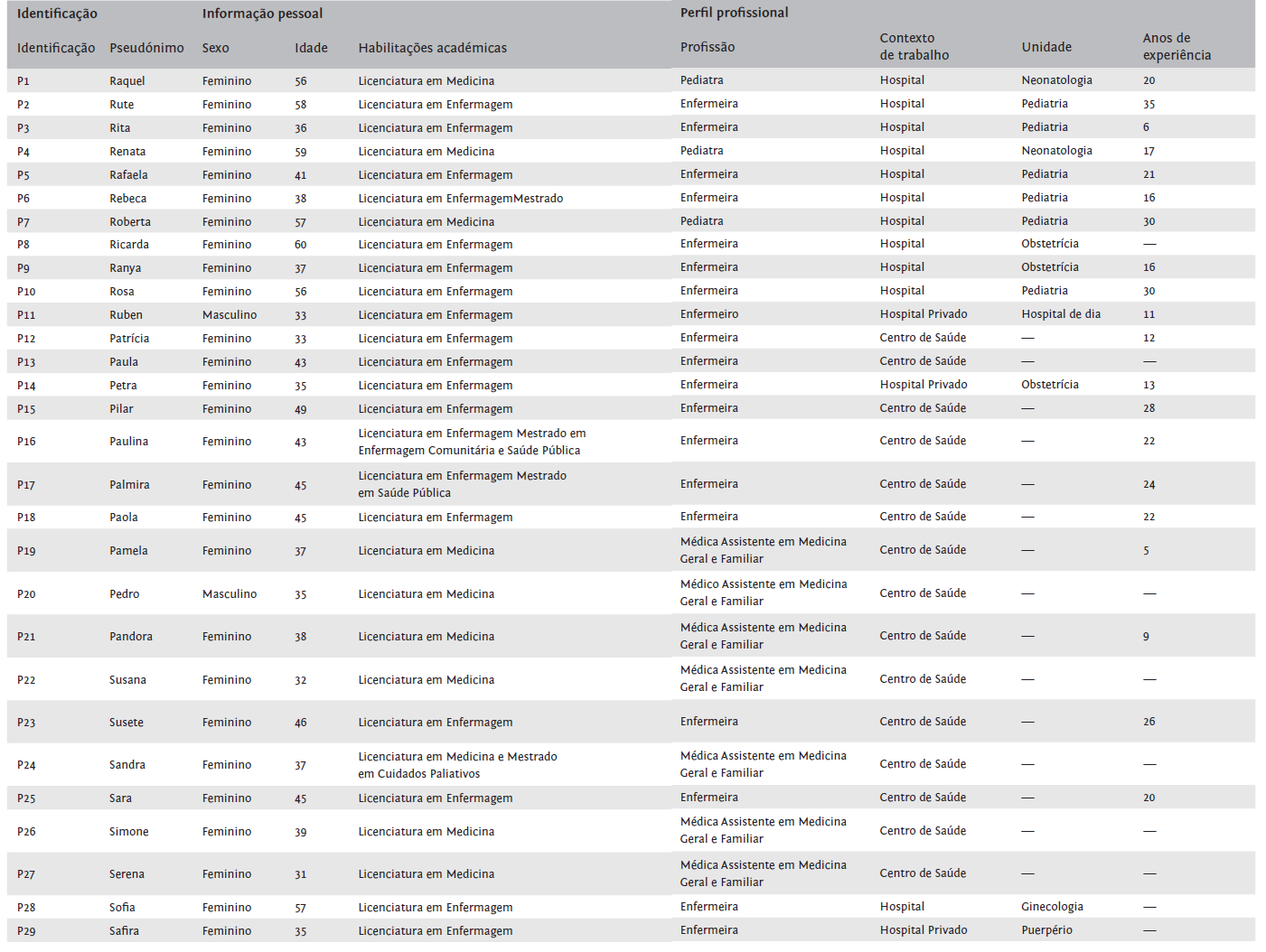 Foram realizadas 29 entrevistas semi-estruturadas (19 com enfermeiros e 10 com médicos), que duraram entre 40 minutos e uma hora e 15 minutos. As entrevistas foram realizadas pessoalmente (no local de trabalho dos profissionais de saúde) ou online (via Zoom). Foi utilizado um guião com perguntas estabelecidas à priori, mas suficientemente aberto para serem introduzidas novas questões ou alterada a sua ordem. O direito à privacidade, confidencialidade e anonimato foi respeitado no desenvolvimento do estudo. A maioria dos participantes era do sexo feminino (n = 27), com uma idade compreendida entre os 31 e os 60 anos. Os profissionais de saúde entrevistados trabalhavam em ambiente hospitalar (ambulatório, neonatologia, puerpério, pediatria, obstetrícia e ginecologia) ou em centros de saúde. A Tabela 1 contém informação detalhada acerca dos dados sociodemográficos dos participantes.