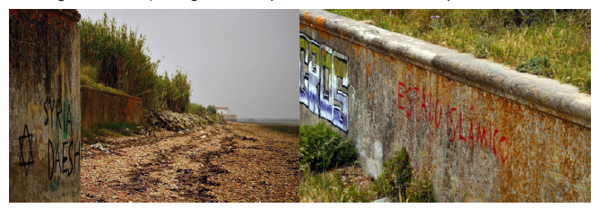 Figuras 1 e 2 - Pichagens alusivas ao Estado Islâmico pintadas num muro junto a uma praia fluvial da margem sul do Tejo, alegadamente por alunos de uma escola próxima.