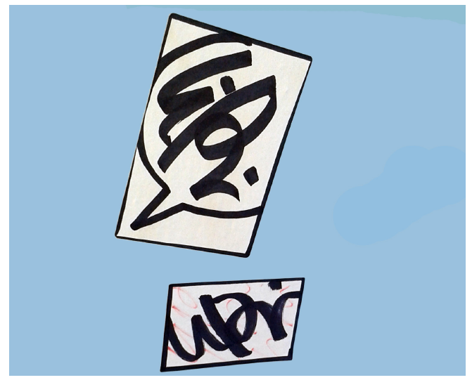 Figura 4 Autocolantes com caracteres desconhecidos encontrados num pilar metálico de um passadiço do terminal fluvial do Terreiro do Paço (Lisboa) em 2016.