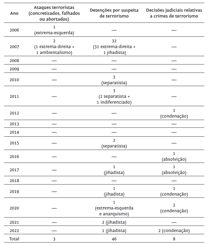 Quadro 1 Ataques terroristas, detenções policiais por suspeita de terrorismo e decisões judiciais relativas a crimes de terrorismo em Portugal (2006-2022).