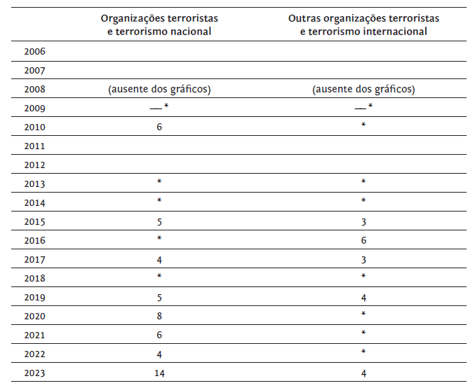 Para além de irrisórios, os números relativos à atividade terrorista em Portugal são igualmente episódicos, sendo tantos os anos em que não acontece nada como os anos em que quase nada acontece. Assim, de um total de 46 detenções por suspeitas de terrorismo entre 2006 e 2022, 32 ocorreram num único ano (2007), quase integralmente ligadas ao movimento de extrema-direita Portugal Hammerskins, filiado na organização internacional Hammerskins Nation, que representa provavelmente a ameaça mais séria que o país enfrenta neste campo (Ventura e Dias, 2015, pp. 57-58). Impressões idênticas provêm da consulta dos Relatórios Anuais de Segurança Interna, que registam 72 participações relacionadas com terrorismo feitas às forças policiais ou pelas forças policiais no período de 2006 a 2023, tendo em conta as duas categorias criadas em 2007 para efeitos de medição desta atividade criminosa (ver Quadro 2) e que quase sempre têm figurado no último lugar das contabilizações dos crimes violentos e graves.