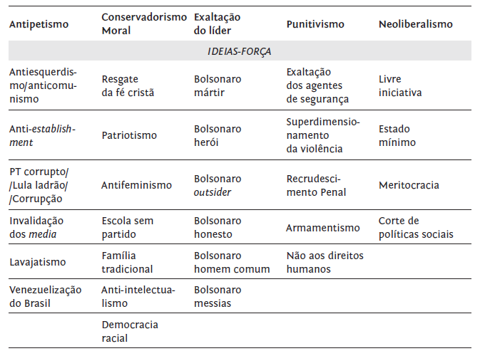 O Quadro 1 apresenta as constelações de sentido e os padrões recorrentes expressos na propaganda política promovida pelos 31 agitadores bolsonaristas-raiz selecionados, a partir do inventário das ideias-força que se repetiram e sustentaram os seus discursos durante a campanha eleitoral de 2018, os quais configuraram certos campos semânticos, assim definidos: o antipetismo, o conservadorismo moral, a exaltação do líder, o punitivismo e o neoliberalismo.