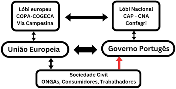 O copa-cogeca representa 22 milhões de agricultores e 22 mil cooperativas dentro do espaço da União Europeia. De acordo com os números oficiais do Registo da Transparência das instituições europeias, o copa-cogeca realizou uma despesa em atividades de lobbying superior a 2,5 milhões de euros em 2018. Para além das reuniões formais com as instituições europeias (Comissão Europeia e Parlamento Europeu), o copa-cogeca tem uma forte presença nos comités de peritos que fornecem trabalho de assessoria técnica aos legisladores. Segundo dados da Comissão Europeia, esta megaorganização representativa do setor agrícola europeu está presente em pelo menos 38 destes comités, com especial destaque para o comité especializado na pac. As grandes associações e confederações nacionais de agricultores (Confederação dos Agricultores de Portugal - cap; Confederação Nacional das Cooperativas Agrícolas e do Crédito Agrícola de Portugal - confagri; e a Confederação Nacional da Agricultura - cna), ao mesmo tempo que negoceiam com o governo português, estão igualmente representadas na Europa, seja através do copa-cogeca, seja através da Via Campesina. A sociedade civil tem também canais próprios para interagir com as instituições europeias, como iremos ver. O mesmo não acontece com o governo português (ver Figura 1).