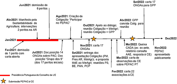 A Coligação Cívica - Participar no pepac trabalhou numa janela temporal bastante curta de 12 meses, até à aprovação da versão final do pepac em agosto de 2022 (ver síntese do processo na Figura 1). Reuniu com os partidos políticos na Assembleia da República e com organizações representativas dos agricultores e de outros agentes do desenvolvimento agrícola e rural. Reuniu com a ministra da Agricultura e manteve um diálogo permanente com o Gabinete de Planeamento, Políticas e Administração Geral (GPP), o organismo responsável no Ministério da Agricultura pela coordenação da preparação do pepac. Desdobrou-se em vários fóruns de debate e manteve uma presença regular na comunicação social (jornais e televisões), por sua iniciativa ou respondendo a solicitações da mesma.9