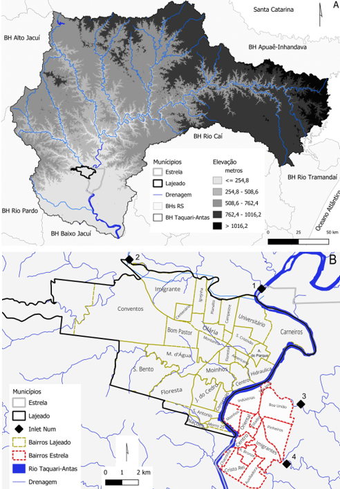 Os municípios de Estrela e Lajeado (fig. 1) fazem parte da Bacia Hidrográfica (BH) do rio Taquari-Antas, a qual drena a porção nordeste do estado do Rio Grande do Sul, escoando em direção à depressão periférica, desaguando no rio Jacuí (Secretaria do Meio Ambiente e Infraestrutura [SEMA], 2011). A área total da bacia hidrográfica é de 26 430km2 com altitude máxima de 1266m, altitude média de 599,54m e a altitude mínima de 1m. As áreas urbanas dos municípios encontram-se nas margens direita (Lajeado) e esquerda (Estrela) do rio Taquari. Os eventos hidrológicos extremos na BH do Taquari-Antas, são deflagrados tanto por precipitações de longa duração associadas à passagem de frentes frias, como a episódios de precipitação de menor duração e grande volume, vinculadas a chuvas convectivas, mais típicas dos meses de verão (Companhia de Pesquisa de Recursos Minerais [CPRM] 2021; Rossato, 2011).