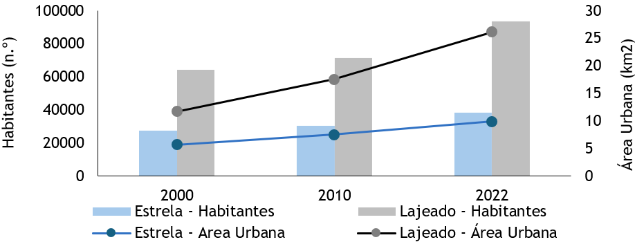 Comparando os dados populacionais dos dois municípios para os censos de 2000, 2010 e 2022 do IBGE, se verificou uma ampliação no número de habitantes (fig. 7). Isso se deve às características econômicas dos dois municípios, os quais possuem um desenvolvimento industrial que gera empregos e atrai pessoas de outras porções do estado (Rubin et al., 2008). O aumento populacional tem fomentado o crescimento da urbanização, a qual nem sempre é feita de maneira planejada (Maricato, 1995).