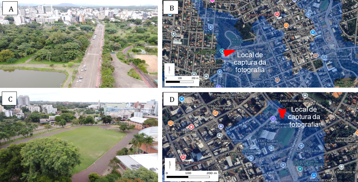 Em Lajeado, um dos bairros com maior recorrência é o Centro. Na área do parque dos Dick (fig. 9A e 9B), localizado próximo ao bairro Centro, os eventos hidrológicos registados em setembro de 2023, porções de terra com edificações foram atingidas. Na figura 9C e 9D, observa-se a indicação de um limite de área inundável próximo ao cruzamento da rua Carlos Von Koseritz com a Avenida Décio Martins Costa, o qual é indicado pela seta.