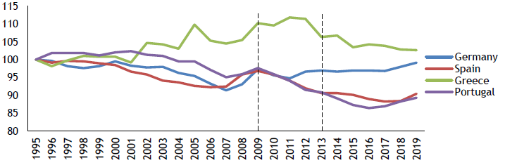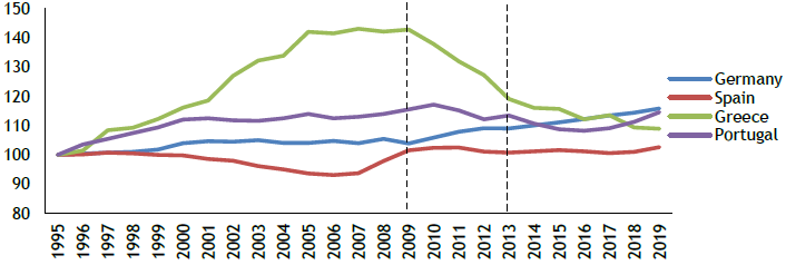 The third period is characterised by a discreet positive current account for southern European member states. While the goods balance performed poorly - despite the improvement experienced by Spain - the performance of the current account is significantly influenced by a sharp increase of the service account, driven by the expansion of the tourism, construction, and real-estate sectors. In addition, despite improving their international investment position, both Portugal and Spain remain heavily indebted. During this period, there was also a rapprochement of real compensation of labour to pre-crisis values (fig. 3) as a consequence of actions taken by leftist parties in both Spain and Portugal, which interrupted the trajectory of drastic losses for labour, however, it remained well below the 1995 percentage.