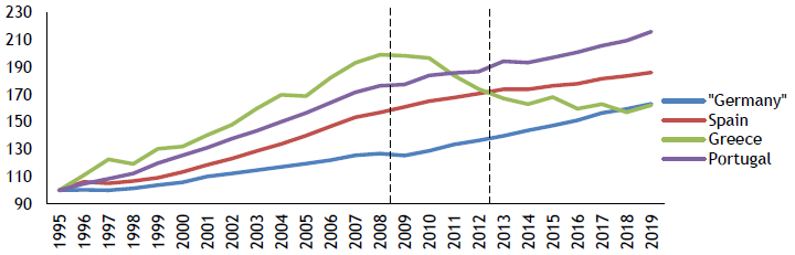 In the Eurozone, it is worth distinguishing three periods: the first running from 1995 until the 2009 crisis management, the second roughly from 2009 until 2013 and a third period running from 2014 onwards. These three periods are closely interrelated, but by disentangling them, it is easier to identify the mechanisms whereby unequal development proceeds in the Eurozone, opposing, for instance, the strong German economy to the peripheral southern economies, particularly Portugal, Greece, and Spain.1