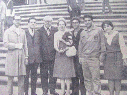 Figura 14: Fotografia de Maria Lívia São Marcos no curso realizado em Santiago de Compostela (Espanha) sob a orientação de Andrés Segóvia. Fonte: Arquivo pessoal de Maria Lívia. Nota. Da esq. para direita: Raul Maldonado, Ernesto Bitetti, Andrés Segovia, Emilita (esposa de Segóvia), Enrique Flores, [não identificado] e Maria Lívia.