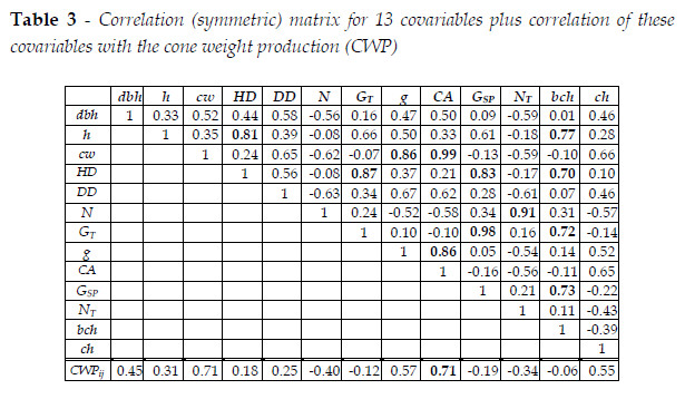 A logarithmic transformation (natural log) of cone weight production per tree allowed obtaining a Gaussian distribution (graph not shown) for the transformed data, more appropriate to fit linear (Gaussian) mixed models. Table 3 shows the sample correlation matrix of these data revealing that, as expected, some independent variables are strongly correlated, with correlation measures greater than 0.7, reflecting multicollinearity between variables. These high correlations implicate a selection of the independent variables to fit with the linear mixed models for quantifying cone production.