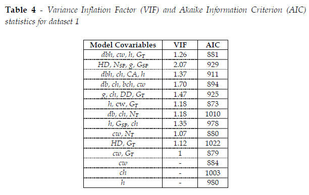 For the modelling of cone production with the dataset 1 (Table 1), we firstly made a screening analysis of independent biometrical variables, by least squares regression of two ensembles of 13 and 7 covariables and of 14 ensembles of four, three, two and one covariables for detecting the ensembles of independent covariables with lower collinearity (low variance inflation factor), and higher coefficient of determination between them. Table 4 displays collinearity and AIC statistics for the 14 ensembles of independent variables. The two ensembles with higher number of variables showed, as expected, high level of collinearity between covariables and were discarded for posterior analysis. To a subsequent selection, the 14 ensembles of variables were submitted to a LMM fitting process, under a two level clustered data structure, with an intercept term, using the SAS PROC MIXED (Version 9.1.3). This selection was based on the information criteria (-2log likelihood and AIC) and the fixed and random parameters significance and on a general residual diagnostic (INFLUENCE option of PROC MIXED) as well.