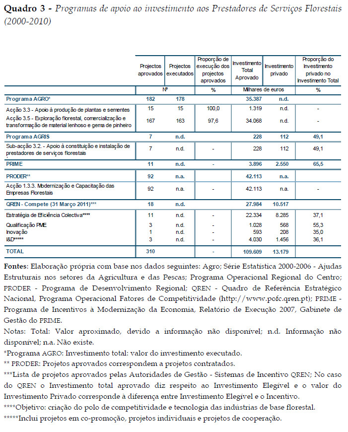 Também os programas de apoio ao investimento dos prestadores de serviços florestais totalizaram entre 2000 e 2010 um investimento global de 109.609 milhares de Euros, distribuído por 310 projetos (Quadro 3). De destacar o apoio à modernização e capacitação das empresas florestais, cuja ação apresenta o maior volume de investimento total aprovado.