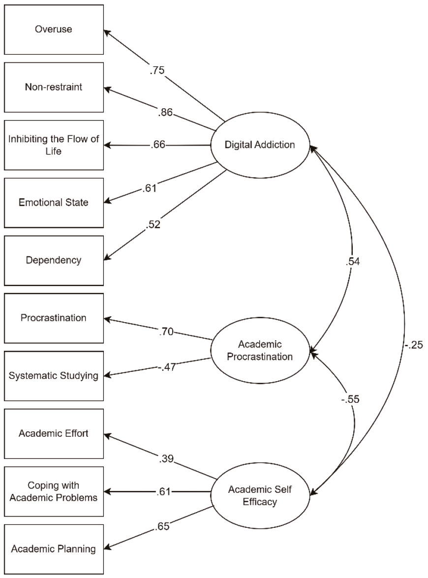 The correlations between the variables are shown in Table 2. An analysis of the table shows that the procrastination sub-dimension has a negative high-level correlation with the systematic studying sub-dimension (r=-.616, p<.001), a negative low-level correlation with the academic effort sub-dimension of academic self-efficacy (r=-.137, p<.01), a negative medium-level correlation with coping with academic problems (r=-.394, p<.001) and a negative medium-level correlation with academic planning (r=-.386, p<.001). There are positive correlations between procrastination and sub-dimensions of digital addiction. High level correlations were observed with overuse (r=.526, p<.001), medium level with non-restraint (r=.408, p<.001), emotional state (r=.294, p<.001) and inhibiting the flow of life (r=.384, p<.001) and low level with dependency (r=.257, p<.001). The systematic studying sub-dimension was positively and moderately correlated with academic effort (r=.243, p<.001) and coping with academic problems (r=.463, p<.001) and highly correlated with academic planning (r=.534, p<.001), which are sub-dimensions of academic self-efficacy. While there were negative and moderate correlations with overuse (r=-.306, p<.001), non-restrain (r=-.203, p<.001), emotional state (r=-.155, p<.001), and inhibiting the flow of life (r=-.272, p<.001), no correlation was observed with the dependency sub-dimension. There are positive and high-level correlations between the sub-dimensions of academic self-efficacy. Similarly, positive, moderate and high-level correlations were observed between the sub-dimensions of digital addiction.