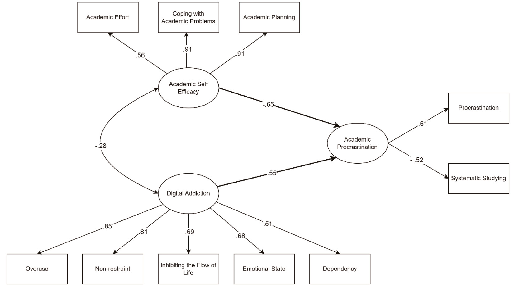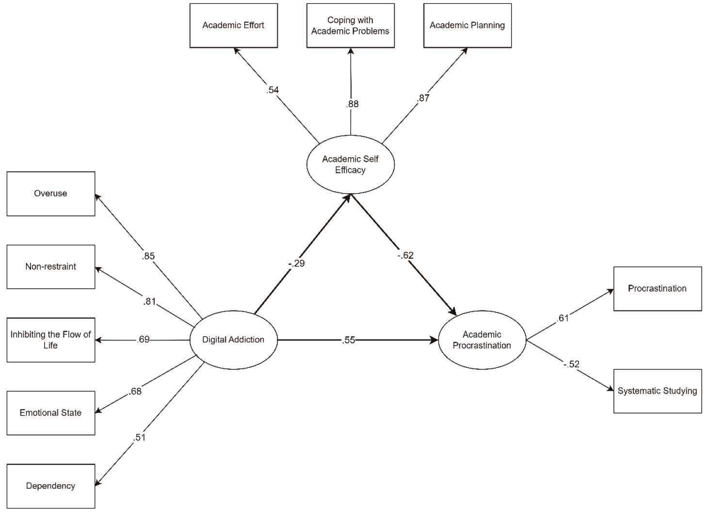 Moreover, the path coefficients calculated in the second model indicate that while the indirect effect of academic self-efficacy is statistically significant (p<0.001), it is limited in its impact. This limitation can be attributed to the direct relationships observed between digital addiction and academic procrastination, as well as between digital addiction and academic self-efficacy. Studies have shown that higher levels of digital addiction correlate with increased academic procrastination, as students struggle to manage their time effectively due to distractions from digital devices (Anierobi et al., 2021). This is corroborated by research indicating that students with higher digital addiction levels report lower academic self-efficacy, which in turn exacerbates procrastination tendencies (Li et al., 2022).