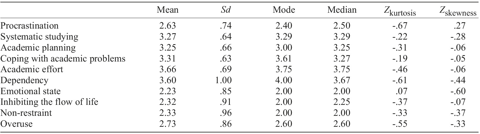 The study utilized three different scales to gather information on students’ academic procrastination, academic self-efficacy, and digital addiction. Table 1 shows the descriptive statistics of the variables analyzed in the study. The Academic procrastination scale consists of two sub-dimensions (procrastination, systematic studying), the academic self-efficacy scale consists of three sub-dimensions (coping with academic problems, academic effort, and academic planning) and digital addiction consists of five sub-dimensions (overuse, non-restraint, inhibiting the flow of life, emotional state, and dependency). The table presents an analysis of mean, standard deviation, mode, median, Z skewness, and Z kurtosis values. The Z-scores for kurtosis and skewness of the variables were all within the range of -1.96 to 1.96, which suggests that the normality assumption was met (Field, 2016).