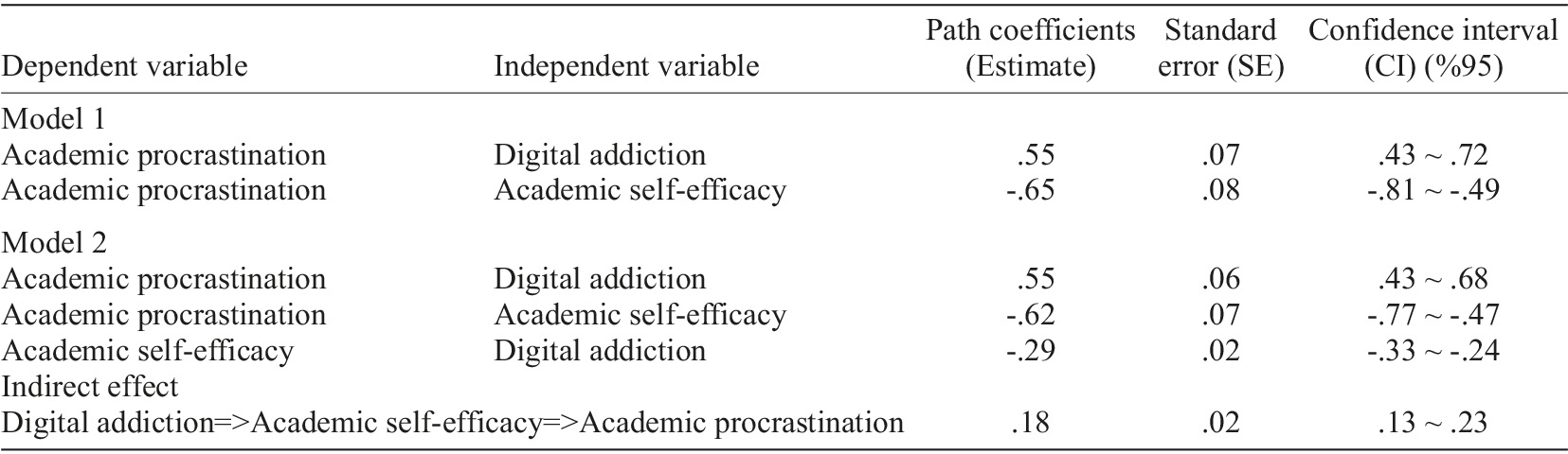 The first model (see Figure 2) examined the effects of digital addiction and academic self-efficacy on academic procrastination. The second model (see Figure 3) was created to investigate the role of academic self-efficacy as a mediator in the relation between digital addiction and academic procrastination and calculate the path coefficients between the variables. The path coefficients of the models are shown in Table 3. The coefficients in the models are statistically significant (p<.001), as is the indirect effect obtained in the second model.