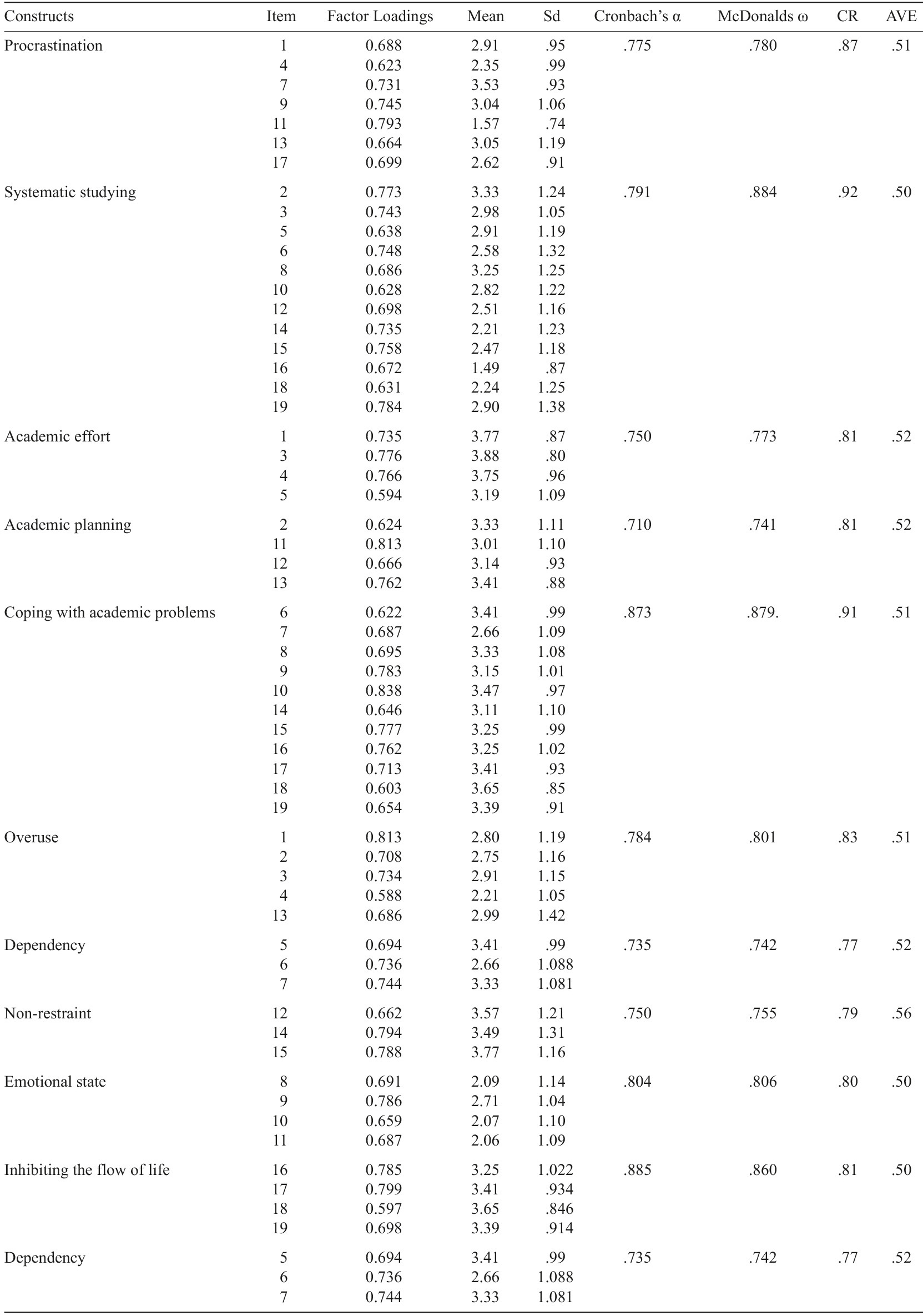 Academic Procrastination Scale: The study utilized the Academic Procrastination Scale, which was developed by Çakici (2003). The scale was developed in a study that included high school and university students as participants. The Academic Procrastination Scale consists of 19 statements, of which 12 are negative, and seven are positive. The positive statements include studying, preparing for exams, and working on projects. The positive items are coded in reverse. The scale consists of two sub-dimensions: the first factor is procrastination, and the second is systematic studying. High scores on the scale are accepted as an indicator of academic procrastination. The Cronbach’s alpha reliability coefficient of the scale was found to be .92.