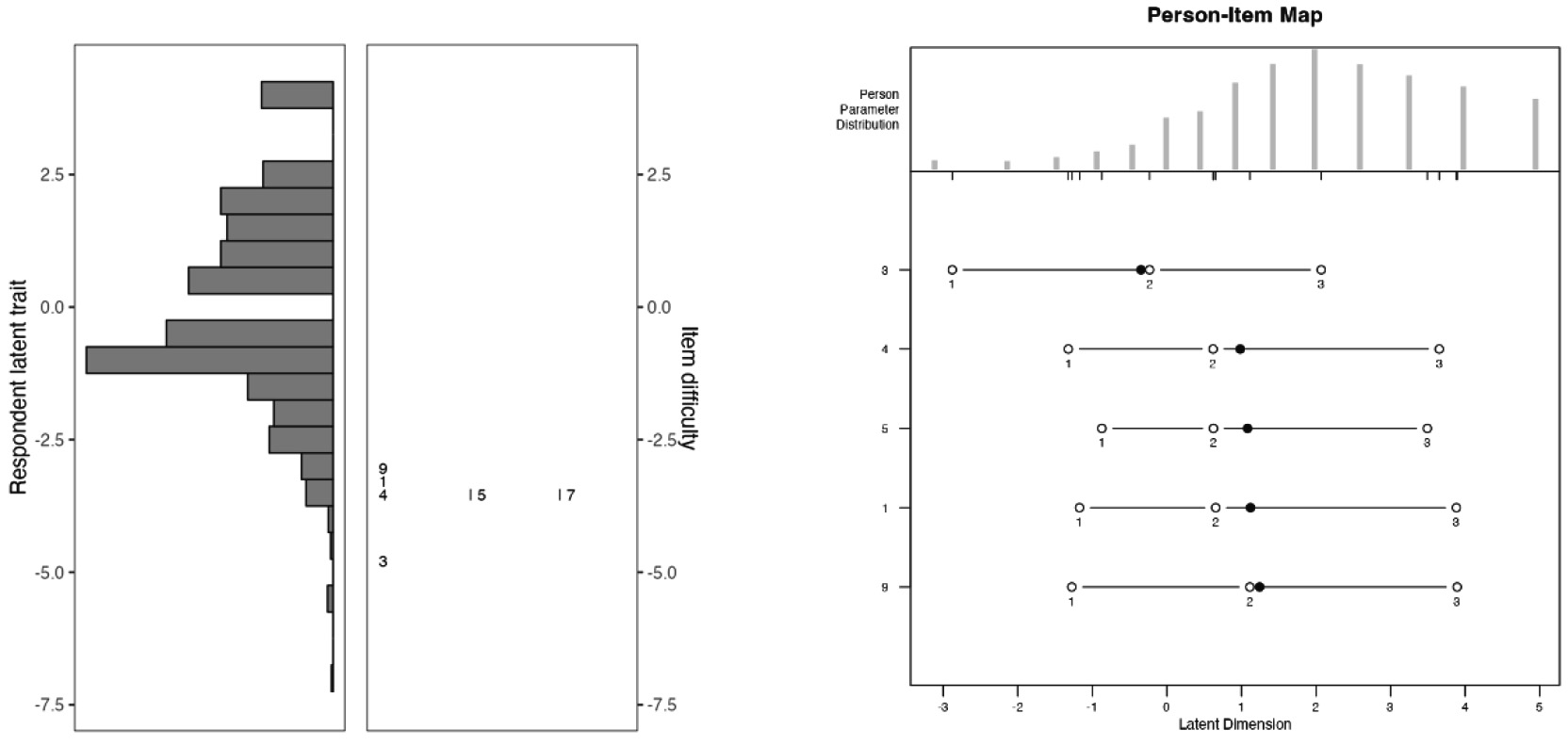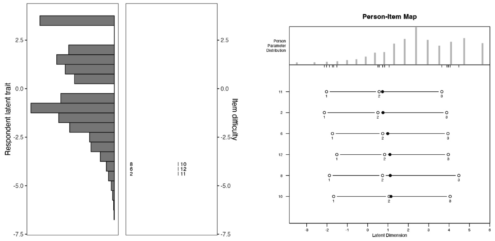 The results of participants’ ability level and item difficulty are presented in Figure 2 (left figure). It is possible to verify that most participants have ability level close to theta of -1.0. In terms of the items, the item 3 is the easiest to endorse (less ability required), while item 9 requires the highest level of ability for its endorsement.