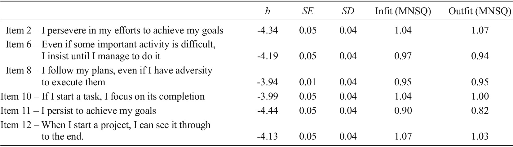 The data indicate that the difficulty of the items was quite low, so that a high level of ability (grit) is not necessary for the person to endorse the highest response alternatives. None of the items in this factor showed a mismatch in the residuals, as values for infit and outfit are adequate.