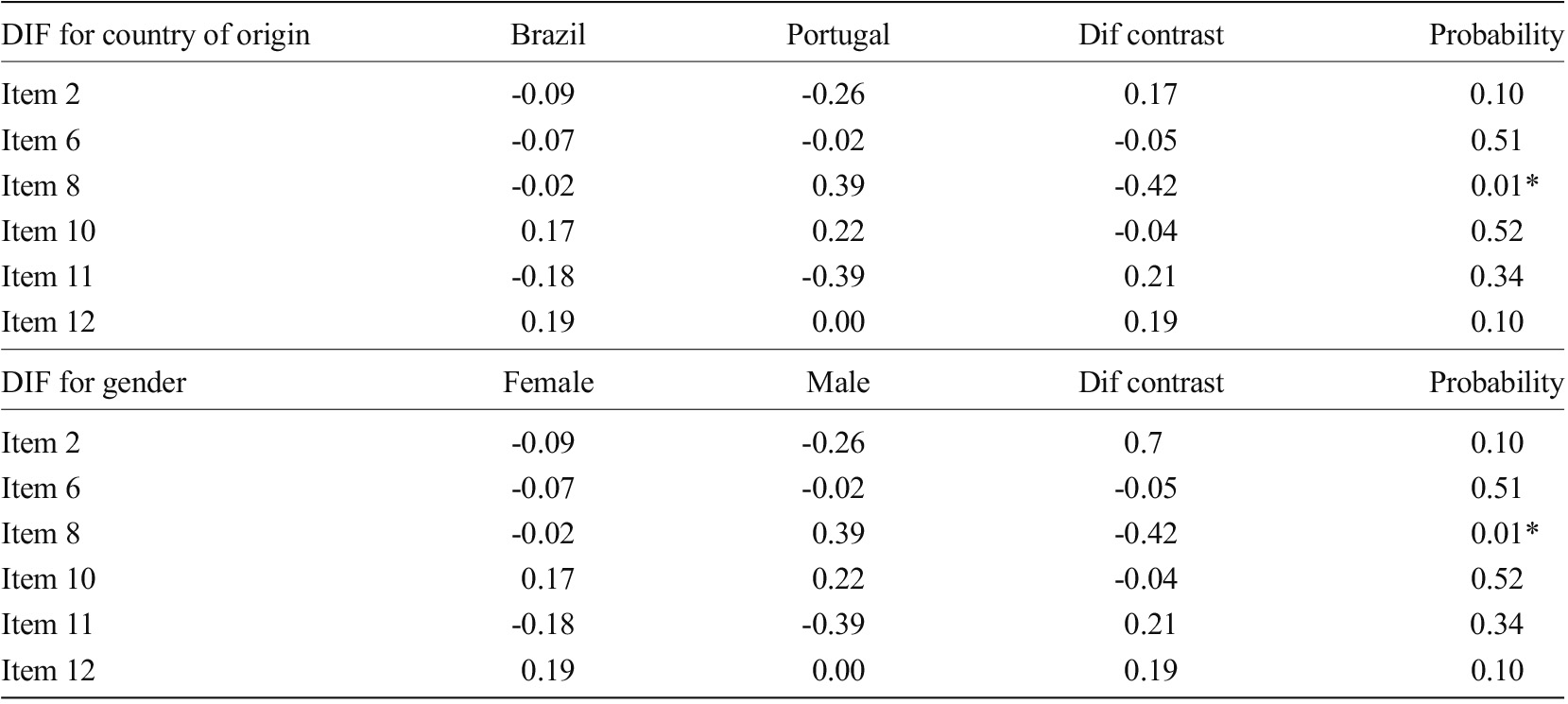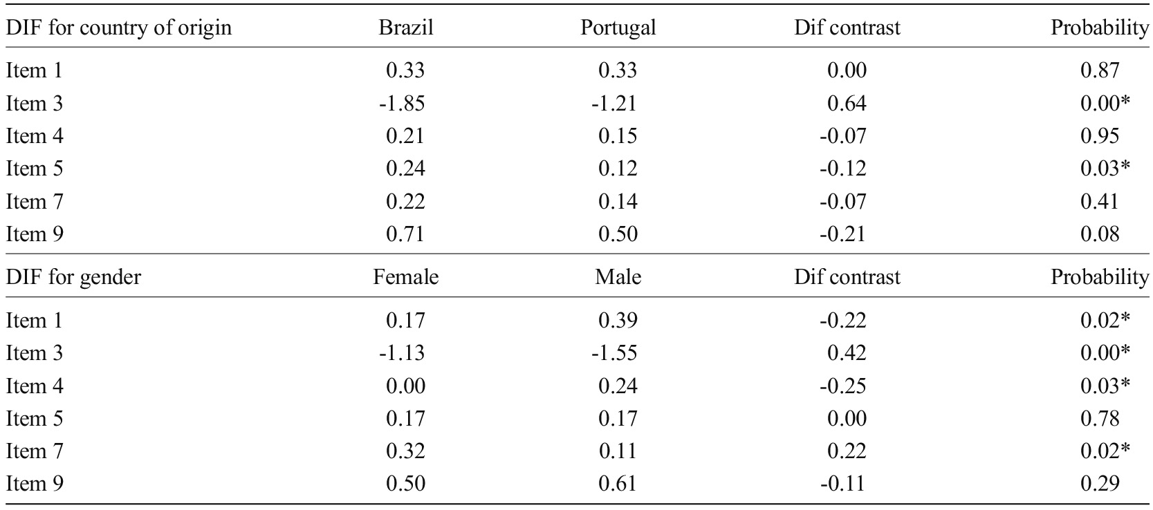 Subsequently, we estimated the differential item functioning (DIF), based on the gender and country of origin of the participants. This type of analysis is used to verify the existence of items with different difficulty between groups, favoring one of them. In this sense, depending on the group where the person is inserted, the item may be more easily endorsed or require a higher level of skill to be endorsed (Yiğiter & Boduroğlu, 2024). Items that present DIF indicate that individuals who have the same level of ability can perform differently on a test, revealing that these items cannot assess the construct fairly, because the assessment would depend on the group to which the person belongs (Ahangari & Semiyari, 2022). In the present study, as a criterion for assessing DIF, values of probability below 0.05 or DIF contrast greater than 0.42 was adopted, following literature guidelines (Aguerri et al., 2007).