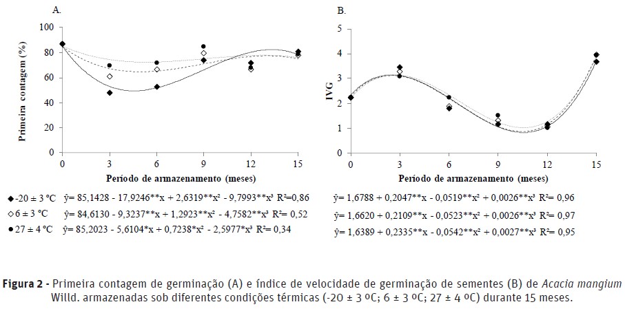 Os dados do IVG ajustaram-se ao modelo cúbico nas três condições de armazenamento. Na Figura 2B, percebe-se redução do vigor avaliada pelo IVG das sementes de A. mangium em todas as condições de armazenamento, com queda acentuada até os 12 meses.