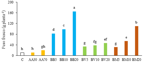 Figura 1 ‒ Peso fresco da alface sem aplicação de fertilizantes (C), com aplicação de adubo azotado nas doses de 30 e 70 kg ha-1 (AA30 e AA70) e com aplicação de compostados de engaço e bagaço de uva com estrume de bovino (BB), estilha da poda (BV) ou palha de milho (BM), nas doses de 5, 10 e 20 t ha-1 (MS).