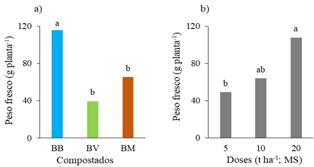 Figura 2 ‒ Peso fresco da alface com aplicação dos compostados de engaço e bagaço de uva com estrume de bovino (BB), estilha da poda (BV) ou palha de milho (BM): (a) para a média das doses de compostado; e (b) para a média dos três compostados nas doses de 5, 10 e 20 t ha-1 (MS).