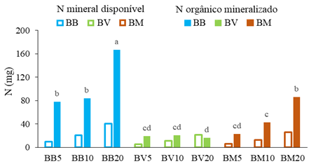 Figura 3 ‒ N mineral do compostado disponível no início do ensaio e N orgânico mineralizado durante o ensaio.