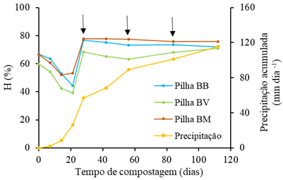 Figura 1 ‒ Teor de humidade nas pilhas e precipitação atmosférica acumulada. As setas representam o revolvimento das pilhas 28, 56 e 84 dias após o início da compostagem.