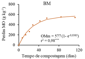 Figura 2 ‒ Perdas de matéria orgânica durante a compostagem de engaço e bagaço de uva com (1:1, v:v) estrume de bovino (BB), estilha da poda de videira (BV) e palha de milho (BM).