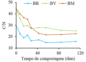 O teor de MO diminuiu rapidamente durante a fase termófila da compostagem devido à mineralização da MO e posteriormente estabilizou (Figura 2). A taxa de mineralização aumentou na pilha BV (k = 0,1268) em comparação com as pilhas BB (k = 0,0450) e BM (k = 0,0365). O material da pilha BV mineralizou mais rapidamente possivelmente porque a estilha da poda tem uma estrutura que permitiu aumentar o arejamento e melhorar a estrutura da pilha em comparação com o estrume de bovino ou a palha de milho. O mesmo foi reportado para a compostagem da mistura da fração sólida do chorume de bovino com tojo, em comparação com a mistura com palha, devido à maior dimensão das partículas do tojo que permitiram um maior arejamento (Brito et al., 2010). Posteriormente, a mineralização foi muito lenta devido à natureza recalcitrante e à dimensão das partículas de estilha da poda (entre 5 e 15 mm de espessura).