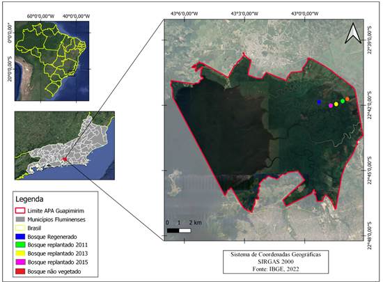 O estudo foi realizado na Área de Preservação Ambiental (APA) de Guapi-mirim, Rio de Janeiro, Brasil (Figura 1). A APA de Guapi-mirim, localizada no recôncavo da Baía de Guanabara, cobre 13 950 há e foi criada em 1984 com o objetivo de proteger os remanescentes de manguezais da região (Pellens et al., 2001). Segundo a classificação de Köppen, o clima da região é Aw, quente e úmido, com estação chuvosa na primavera-verão. Os solos predominantes na APA de Guapi-Mirim são do tipo Hidromórfico Orgânico Tiomórfico, com características de salinidade e presença de enxofre (Araújo e Maciel, 1979). Por ocasião da implantação da APA, antigas áreas de manguezal que foram removidas por atividade antrópica (uso da terra e retirada de madeira) passaram a ser recuperadas seguindo um protocolo de reflorestamento.
