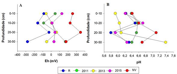 Os bosques avaliados apresentaram condição que variaram de anóxicas (Eh<+100 mV) a óxicas (Eh> +350 mV), com valores de Eh variando entre -346 e +382 mV (Figura 2A). Os maiores valores de Eh foram encontrados no bosque NV (336 mV), enquanto que R e os bosques reflorestados apresentaram valores consideravelmente menores, sendo o menor encontrado em R (-345 mV), indicando que a presença e o desenvolvimento da vegetação conduzem a uma redução do Eh em consequência da excreção de substâncias orgânicas lábeis como açúcares e ácidos orgânicos que reativam a atividade microbiana nestes ambientes (Otero e Macias, 2002). Comparando os bosques R e NV, são especialmente notadas as diferenças significativas para todas as profundidades, com médias de -97,42 e 121,49 mV, para R e N, respectivamente (Figura 2-A).