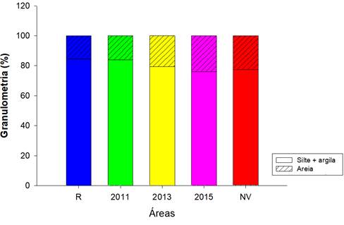 Os valores médios obtidos por bosque para a fração areia e fração fina (silte + argila) podem ser observados na Figura 3. Os maiores valores da fração fina foram encontrados no bosque R e 2011 (90,80 e 86,98%, respectivamente). Os bosques R e 2015 apresentaram mais concentração de areia em profundidade (30,16 e 33,59%) e 2011 e NV, por outro lado, apresentaram menores valores desse atributo em superfície (11,58 e 20,06%). O bosque 2013 apresentou comportamento homogêneo de areia ao longo do perfil do solo. De uma forma geral, foram observados valores baixos de argila, com pouca variação entre profundidades e bosques, com máximo de 1,70% no bosque NV e mínimo de 0,98% no bosque 2013.