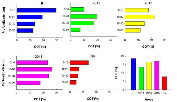 Os resultados dos conteúdos de COT confirmam os elevados conteúdos desse elemento presente em solos de manguezais, com valores obtidos que oscilam entre 44,42 e 3,53%, nos bosques R e NV, respectivamente (Figura 4). De uma forma geral, o comportamento observado em profundidade foi parecido nos bosques replantados, com maiores teores de C entre 10-20 cm com decréscimo em profundidade. Os resultados indicam que parece não haver resposta direta da idade do desenvolvimento vegetal no acúmulo deste elemento para os bosques estudados, possivelmente pela grande heterogeneidade no material sedimentário destes ambientes. Porém, comparando áreas vegetadas (R, 2011, 2013 e 2015) com NV, é possível observar diferenças relevantes no conteúdo de COT, variando, por exemplo, de 7,87 a 18,63% entre NV e R, respectivamente com a média de 17,66% para os bosques replantados (2011, 2013, 2015).