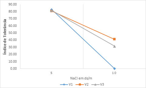 Figura 1 Valores correspondentes ao Índice de Tolerância à Salinidade das cultivares de soja analisadas em diferentes níveis de estresse salino. V1 - ‘Ocephara-4’; V2 - ‘BRS-257’; V3 - ‘GMZ-VAVA’.