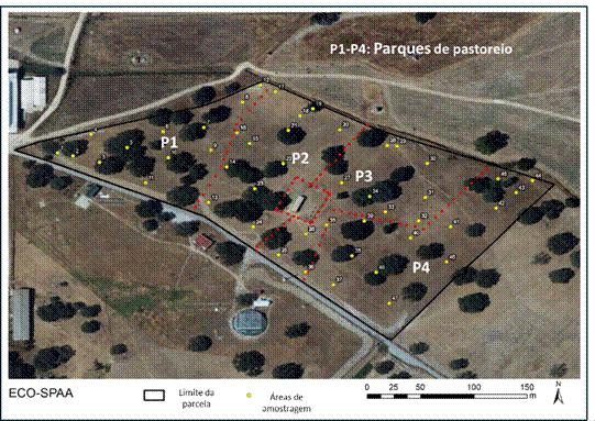 A variabilidade espacial da produtividade e da qualidade é um padrão comum nas pastagens de sequeiro integradas no ecossistema do Montado (Efe Serrano, 2006). Para além da biodiversidade de espécies e famílias botânicas, a presença de árvores e de animais em pastoreio acentua esta variabilidade (Schellberg et al., 2008). Esta variabilidade deve-se a uma série de fatores, incluindo o solo, o ambiente, as alterações sazonais na morfologia da pastagem e a gestão do pastoreio (por exemplo, taxas de encabeçamento, pastoreio seletivo, etc.) (Murphy et al., 2021b). No nosso estudo, a variabilidade espacial é ainda promovida pela gestão logística do campo experimental no contexto de um projeto de investigação sobre pastoreio de ovinos e correção do pH do solo. O campo foi dividido em quatro parques (P1 a P4, Figura 1) de, aproximadamente, 1 ha cada, com dois tratamentos: (i) aplicação versus não aplicação de calcário dolomítico; e (ii) duas intensidades de pastoreio diferentes (taxas de encabeçamento de 1 CN ha-1 e 2 CN ha-1). Cada um destes fatores tem um impacto significativo na pastagem (Efe Serrano, 2006).