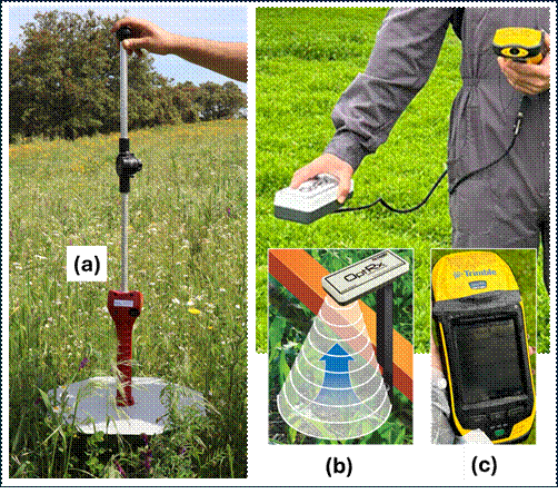 -Um medidor de prato ascendente (RPM), “Jenquip EC20 (Jenquip, 21 Darragh Road, Feilding, New Zealand; Figura 3a) para medir a altura comprimida da pastagem (HRPM);