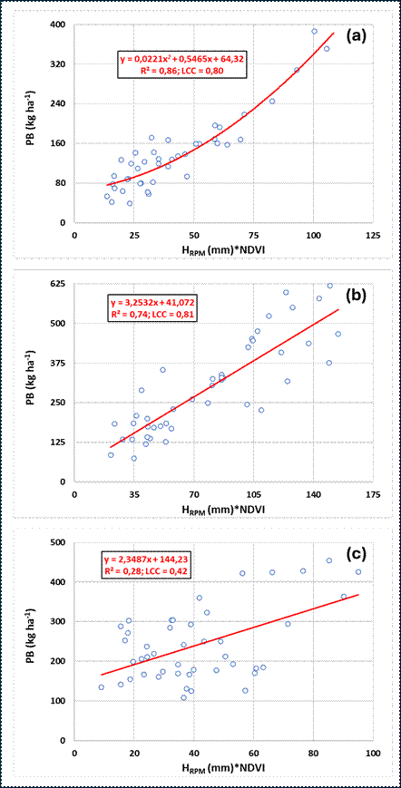 Figura 4 Relação entre a PB da pastagem (em kg ha-1) e o IPQP (=HRPM × NDVI), em dezembro de 2023 (a), em fevereiro de 2024 (b) e em maio de 2024 (c).
