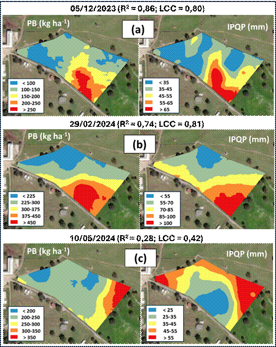 A Figura 5 mostra os mapas que relacionam a PB com o IPQP. Estes mapas captam não só a variabilidade espacial, mas também a sua evolução temporal. Os padrões de variabilidade são captados com maior exatidão nas fases inicial (outono) e intermédia (inverno) do ciclo vegetativo da pastagem, com uma quebra significativa na fase final (primavera). A maior precisão obtida nas fases iniciais do ciclo vegetativo pode ajudar o agricultor a decidir quando parar a suplementação alimentar que ocorre durante todo o período de verão (período sem precipitação e, portanto, sem disponibilidade de pasto). Esta representação espacial reforça o interesse na integração de sensores de medição de pastagens com recetores GNSS, uma abordagem que contribui para a interpretação e gestão da variabilidade espacial das pastagens e do pastoreio, permitindo aos agricultores tomar decisões rápidas e mais informadas (Chapa et al., 2023).
