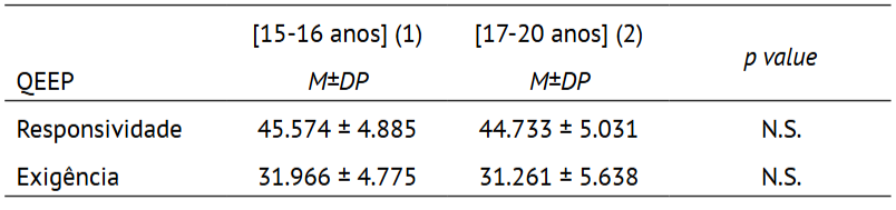 Os nossos resultados em função da variável sexo expuseram diferenças significativas, nomeadamente na dimensão da exigência, sendo que os adolescentes do sexo feminino percecionam os seus pais como mais exigentes comparativamente aos adolescentes do sexo masculino. Corroborando os nossos resultados, estudos realizados por Costa et al. (2000) e por Weber et al. (2004) revelaram que o sexo feminino percecionava maiores níveis de exigência do que o sexo masculino. Uma hipótese explicativa face aos resultados aqui obtidos, poderá estar relacionada com uma maior exigência parental, devido à diferença de papéis sociais tradicionalmente atribuídos às mulheres (e.g., maiores responsabilidades na lida da casa, às tarefas de cuidados, etc). Neste sentido, parece que os adolescentes do sexo feminino se preocupam mais com os outros e com eles próprios, procurando relacionar-se mais com a família e com os amigos (Michek & Loudová, 2014). Segundo o estudo de Markus et al. (2003), os adolescentes do sexo feminino têm uma perceção de menor tentativa de controlo e de maior suporte emocional.