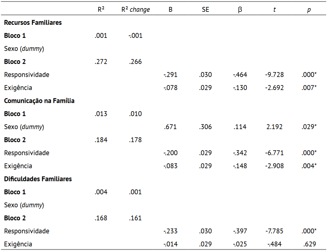 Relativamente à comunicação na família, o sexo teve um contributo significativo [F(39.3013) = 4.807; p = .029] e explica 1.3% da variância total (R² = .013), contribuindo individualmente com 1% da variância para o modelo (R² change = .010). Os estilos educativos parentais tiveram um contributo significativo [F(563.2490) = 27.202; p = .000] e explicam 18.4% da variância total (R²=.184), contribuindo individualmente com 17.8% da variância para o modelo (R² change = .178). Desta forma, e analisando individualmente o contributo de cada uma das variáveis independentes dos blocos, constata-se que três variáveis apresentam uma contribuição significativa (p ≤ .05): a responsividade (β = -.342) e a exigência (β = -.148), ambas predizendo negativamente a comunicação na família, e o sexo masculino (β = .114), predizendo positivamente a comunicação na família.
