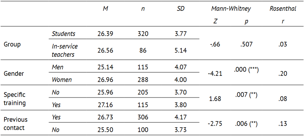 As shown in Table 1, no differences in attitudes were detected between in-service teachers and BSc students (Z = -.66; p > .05). Nevertheless, the differences were significant for the rest of the independent variables. Women (Z = -4.21; p < .001), students with training on inclusion (Z = 1.68; p = .007) and participants who had ever been in contact with people with disability (Z = -2.75; p = .006) showed more positive attitudes toward inclusion. According to the criteria established by Cohen (1988), the effect size was small, being in all cases in the range r ≤ .20.