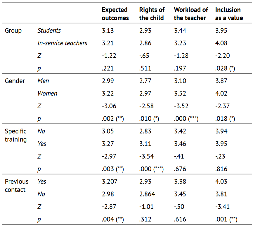 Table 2 contains the mean scores of the four categories proposed by Saloviita (2015) and included in TAIS (Expected outcomes, Rights of the child, Workload of the teacher, and Inclusion as a value). In this case, in-service teachers achieved higher scores than students in the category of Inclusion as a value (Z = 2.20; p = .028). Besides, women scored higher than men in all four categories, the differences being most relevant in the Workload of the teacher (Z = 3.52; p < .001) and Expected outcomes (Z = 3.06; p = .002). Important differences were also found between students who had and had not received training on inclusion, but only in Expected outcomes (Z = 2.97; p = .003) and Rights of the child (Z = 3.54; p < .001). Likewise, participants who had reported contact with people with disability scored higher only in the categories of Expected outcomes (Z = 2.87; p = .004) and Inclusion as a value (Z = 3.41; p = .001).